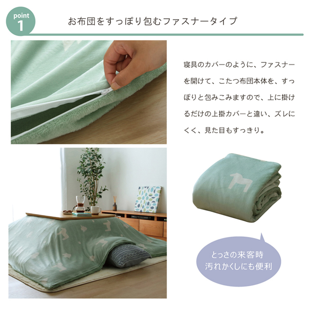 ファスナータイプでこたつ布団をすっぽりと包み込むので、こたつ布団の裏も表も汚れから守ります。