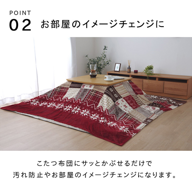 こたつ布団の上にさっとかぶせるだけで汚れ防止やお部屋のイメージチェンジができます。