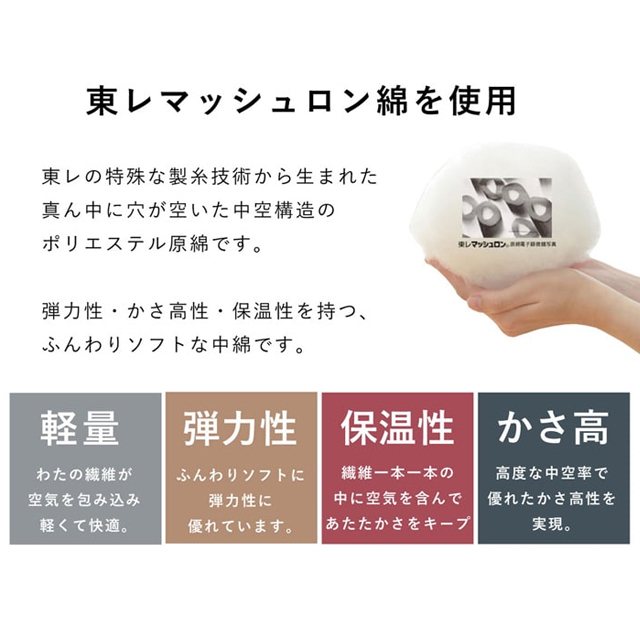 東レマッシュロン綿は、軽量で弾力性と保温性のよいふんわりソフトな綿です。