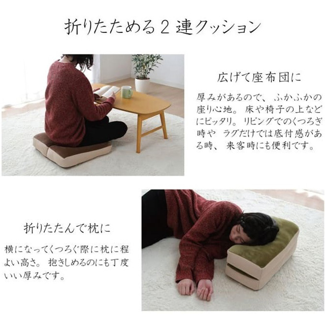 広げれば座布団や腰当てとして、折りたためばゴロンと横になってくつろぐ時の枕に早変わり。
