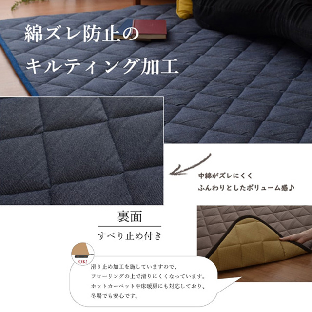 「ウレタン」と「ポリエステルわた」の中材2層構造なので底つき感を軽減し、冬は床からの冷気をシャットアウトしてくれます。