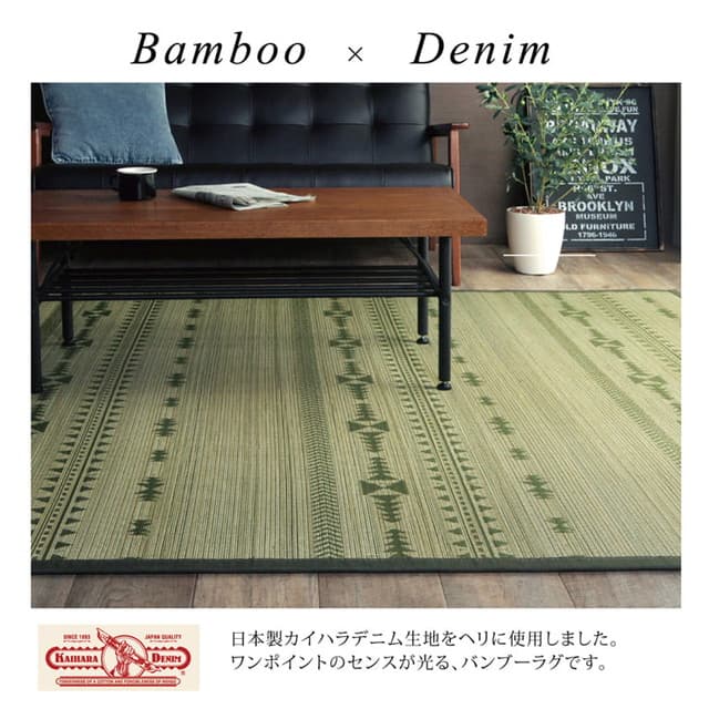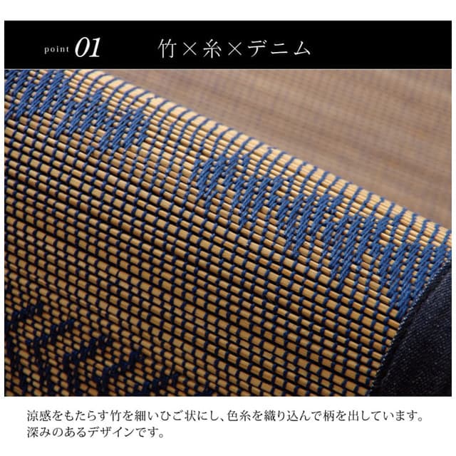 竹の素材感をそのまま出しつつ、織り込んだ色糸とヘリに使用したデニム生地がアクセントになっています。