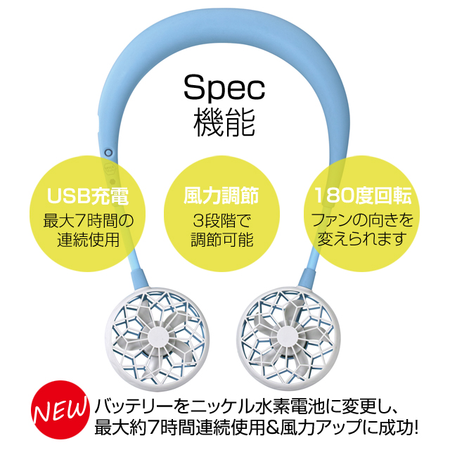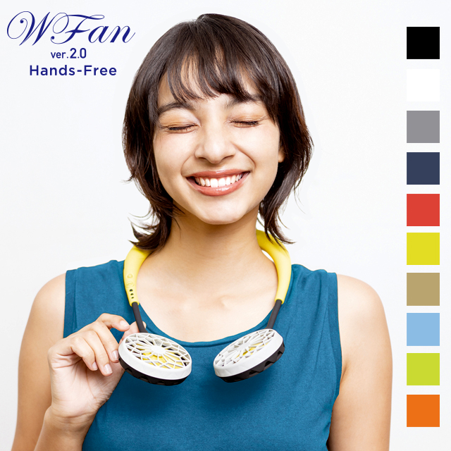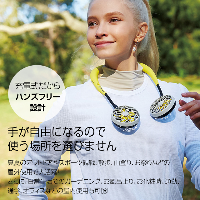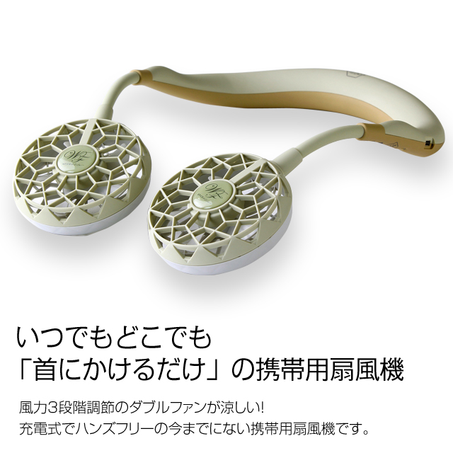 暑い時、暑い場所でいつでもどこでも、首にかけるだけの携帯用扇風機!