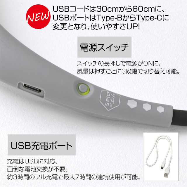 フル充電時で最大約7時間連続使用ができます(微風/約7時間、弱風/約4時間、強風/約2.5時間)。