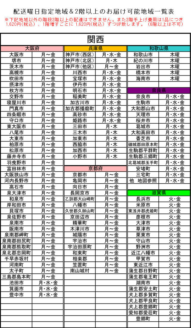 また2階以上のお届け先の場合も下記表でご確認ください。