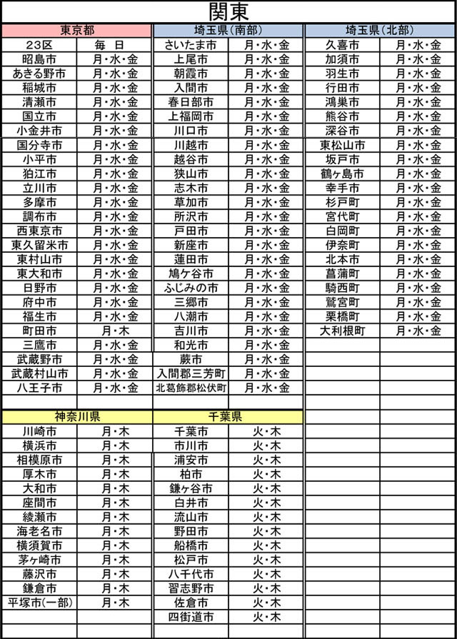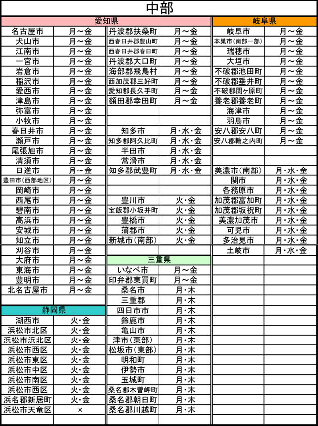 ※地域によってお届けできる曜日が決まっておりますので下記表をご覧いただきご確認下さい。
