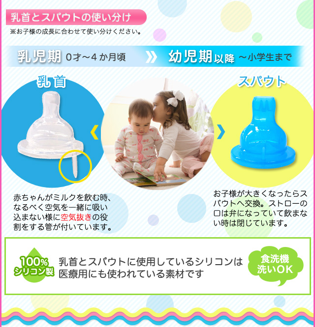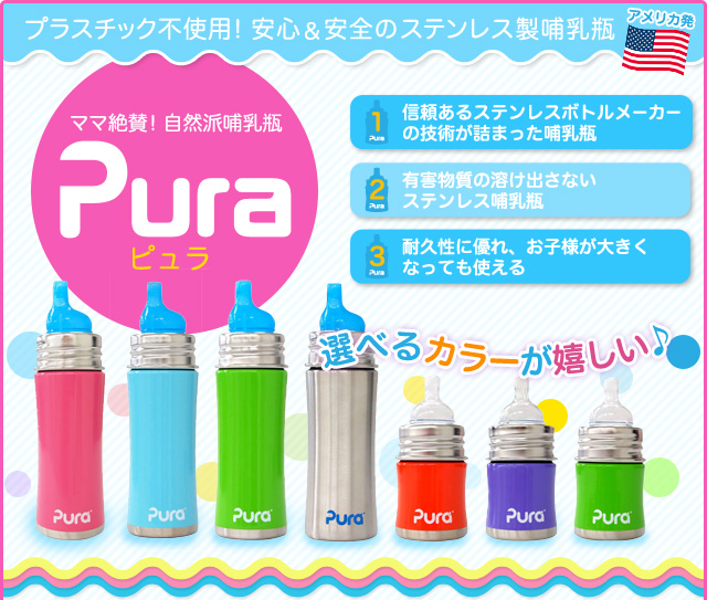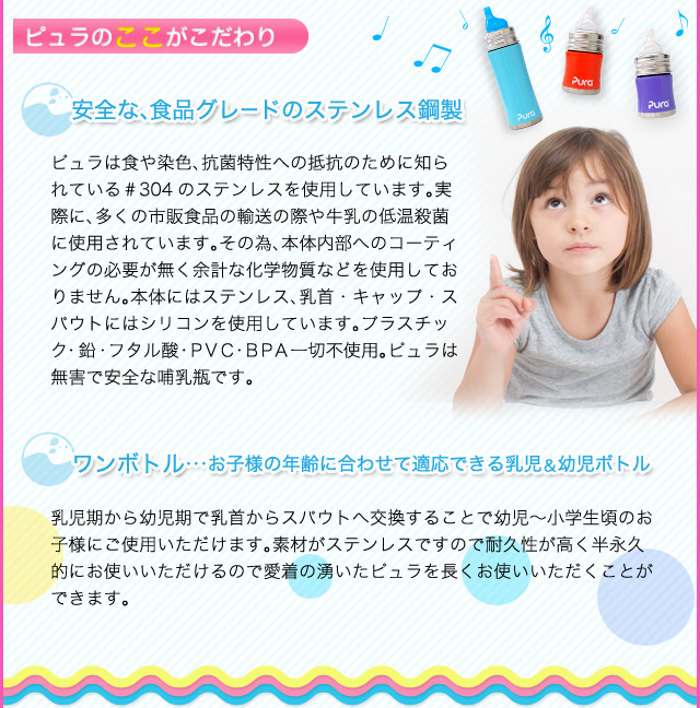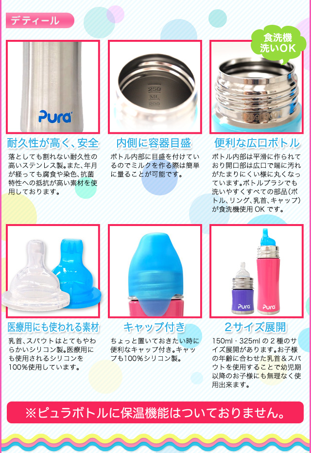プラスチックを一切使用していない哺乳瓶です。ステンレス素材の瓶とシリコン製の乳首は、傷が付いても有害物質や環境ホルモンが溶け出す心配がなく、安全性が最も高い哺乳瓶です。