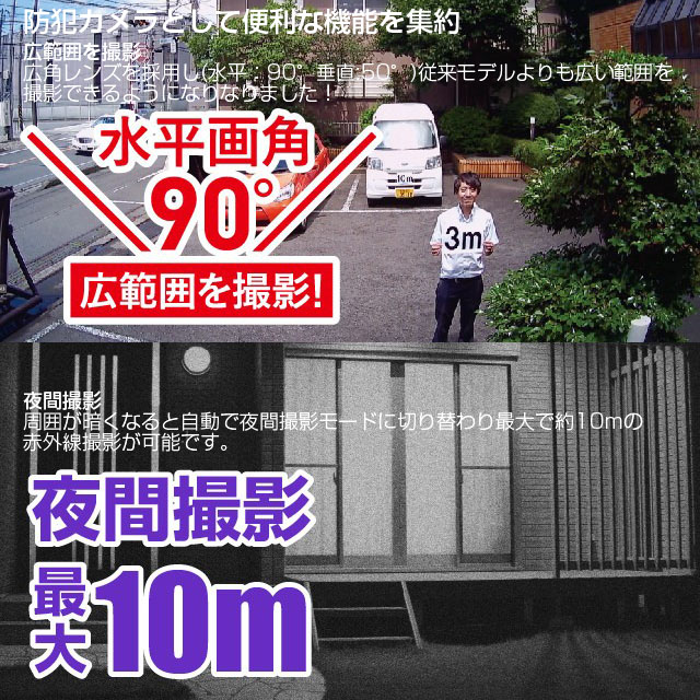 広角レンズを採用し(水平90°、垂直50°)広い範囲を撮影可能です。