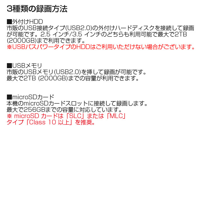市販のUSBメモリ(USB2.0)を挿して録画可能。最大で2TBまでの容量が利用できます。