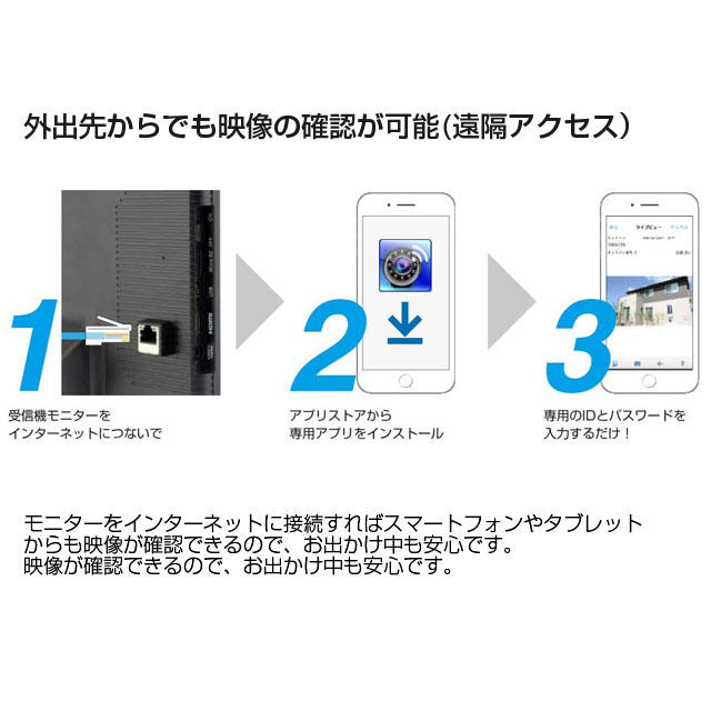 モニターをインターネットに接続すればスマートフォンやタブレットからも映像が確認できるので、お出かけ中も安心です。