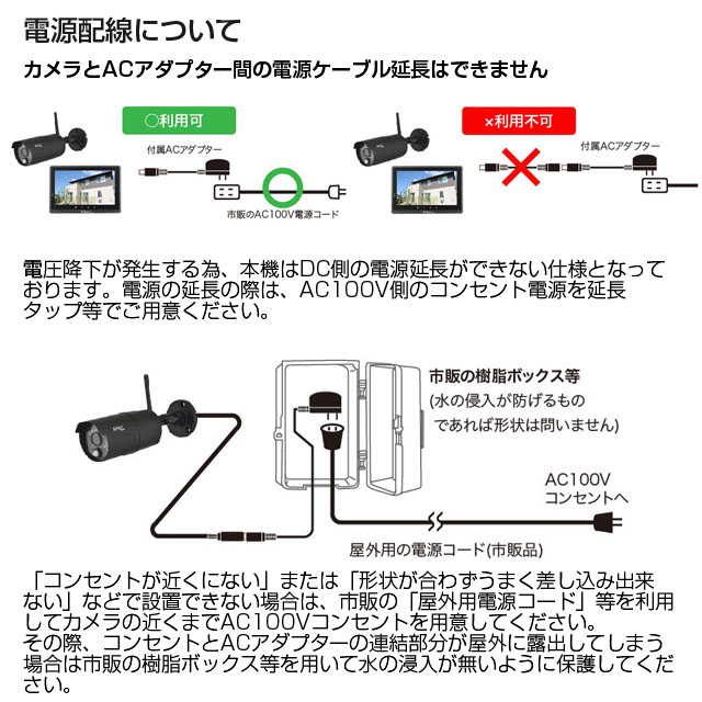 その際、コンセントとACアダプターの連結部分が屋外に露出してしまう場合は市販の樹脂ボックス等を用いて水の浸入が無いように保護してください。