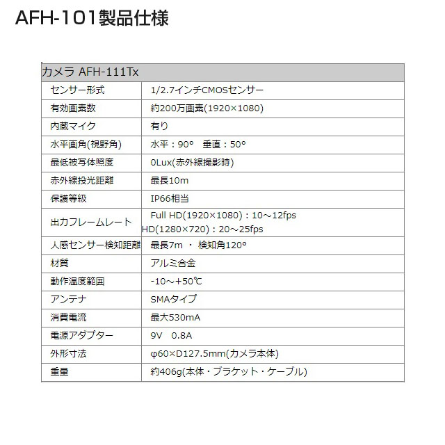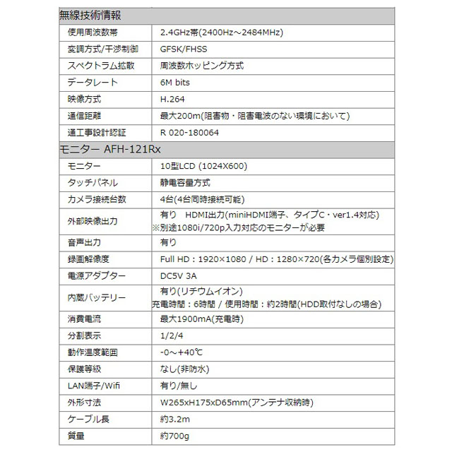 ◆同梱物/無線カメラ「AFH-111Tx」、受信機モニタ「AFH-121Rx」、カメラ用ACアダプター(DC9V・0.8mA)、モニター用ACアダプター(DC5V・3A)、カメラ用無線アンテナ、HDMIケーブル(HDMI-miniHDMI)、LANケーブル、六角レンチ、取付けネジセット、自己融着テープ、取扱説明書(保証書含む)