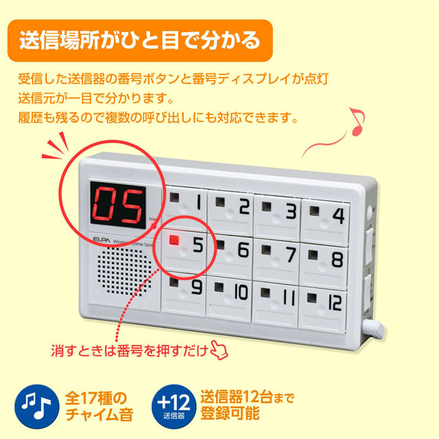 ●受信した送信器の番号ボタンと番号ディスプレイが点灯し、送信元が一目で分かる