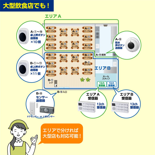●用途に合わせて送信器・受信器の増設も可能(1台の受信器に送信器を12台まで登録可能)