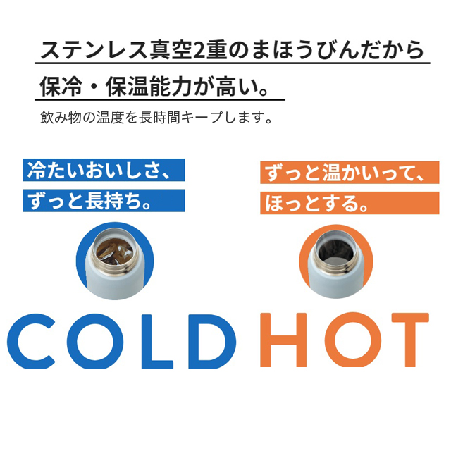 ステンレス真空2重のまほうびんは、保冷能力・保温能力が高く、飲み物の温度を長時間キープします。