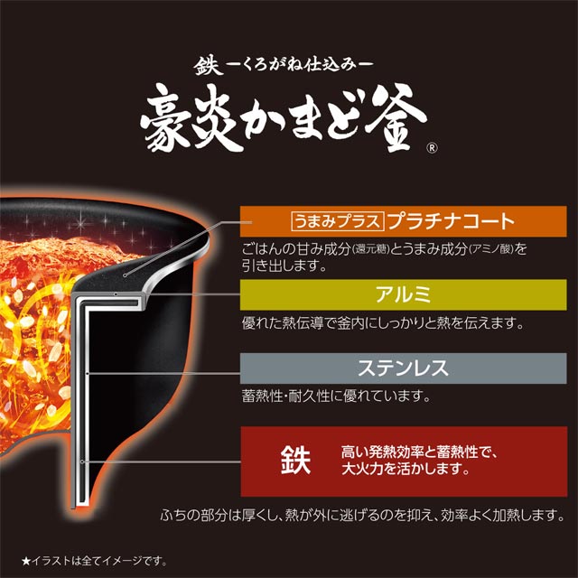IHと相性が良く発熱効率と蓄熱性が高い鉄素材を、熱伝導率の高いアルミ層と耐久性に優れたステンレス層の間に仕込んだ内釜です。
