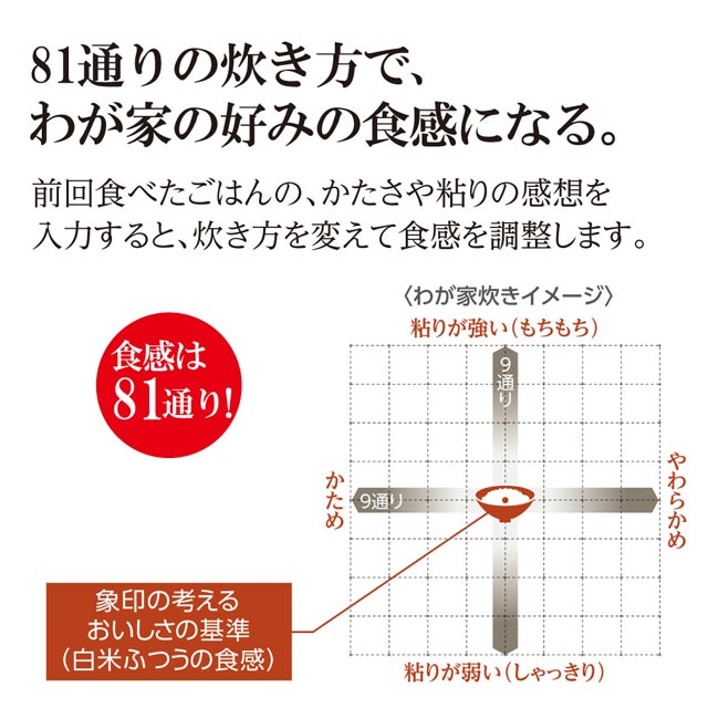 食べたごはんの味の感想をアンケートに回答するだけで、水の量を変更せず炊き方を微調整し、炊くたびに好みの味に進化します。