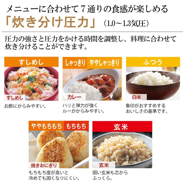 圧力の強さと圧力をかける時間を調整して、「すしめし」、「白米(5通り)」、「玄米」までメニューにあわせて圧力と時間を変えて7通りの食感に炊き分けます。