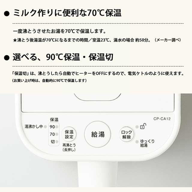 70℃保温は一度沸とうさせたお湯を70℃で保温する、ミルク作りに便利な機能です。