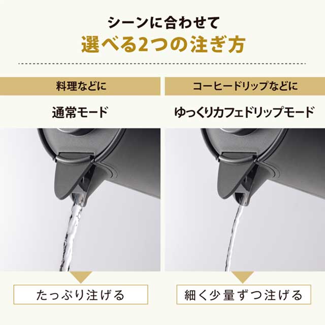 通常モードはカップ麺や調理に、ゆっくりカフェドリップモードはドリップコーヒーや離乳食と日常の幅広いシーンでお使いいただけます。