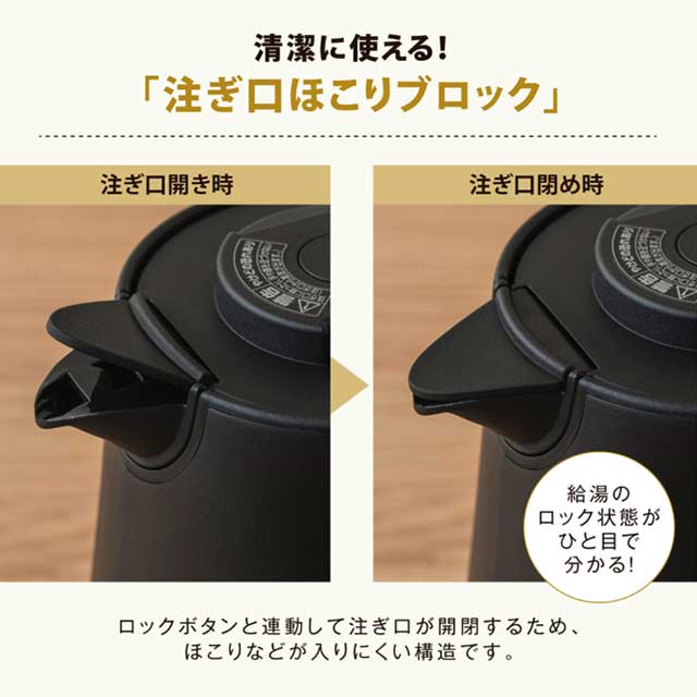 ロックボタンと連動して注ぎ口が開閉するため、ほこりなどが入りにくい構造です。