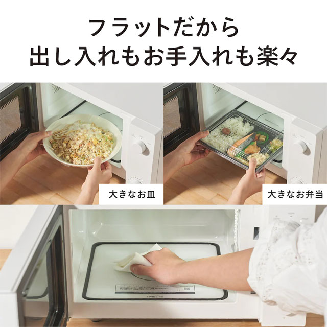ターンテーブルのないフラットタイプの庫内で、大きな容器に入った冷凍食品やお弁当でも庫内に引っかかることなく楽々と出し入れすることができます。