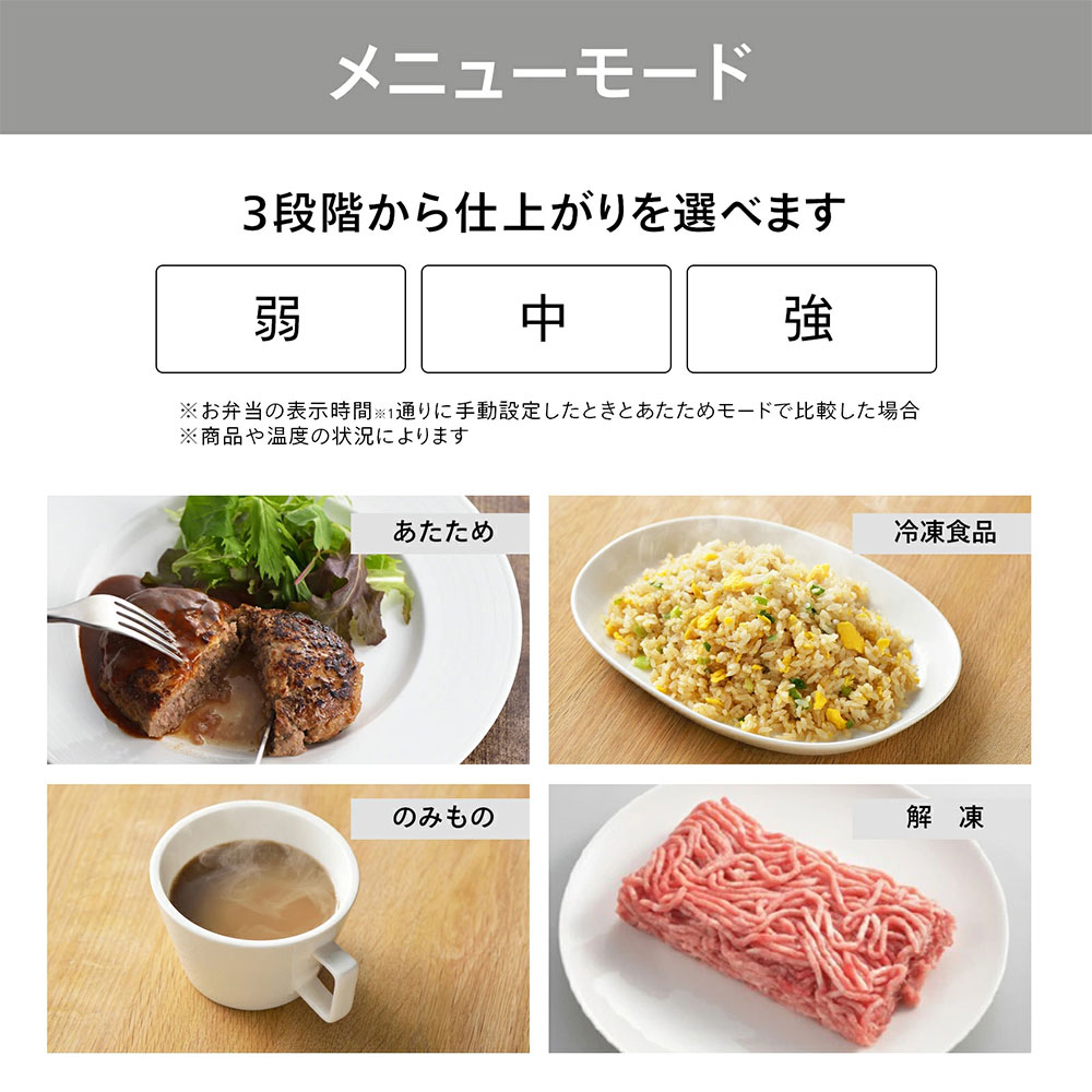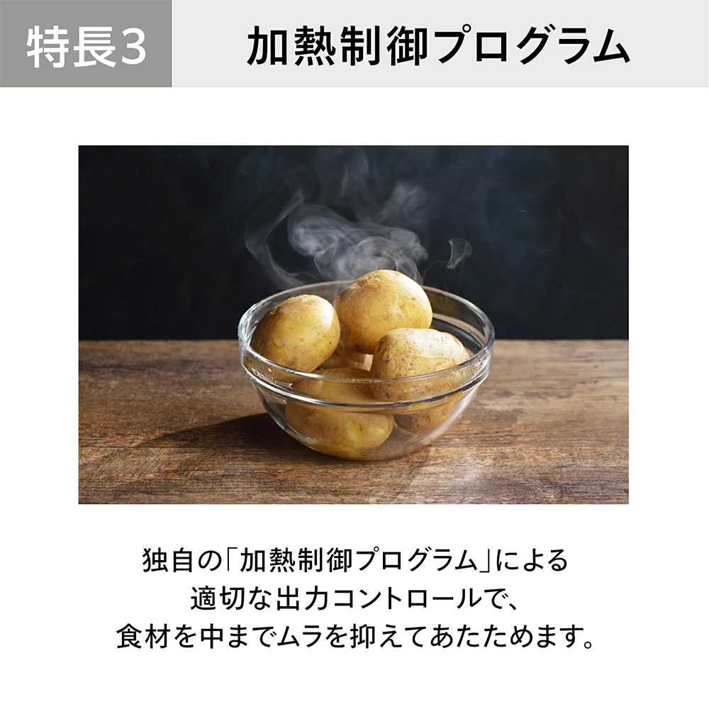メーカー独自の加熱制御プログラムによる適切な出力コントロールで、食材を中までムラを抑えてあたためできます。