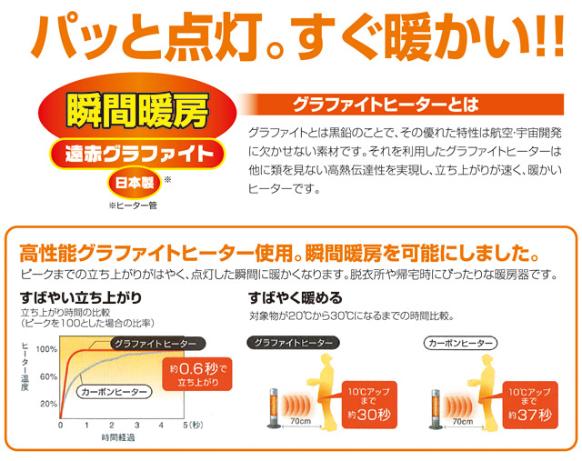 他の暖房器具と比べても、圧倒的に暖まるスピードが速く、わずか0.2秒の速暖です。