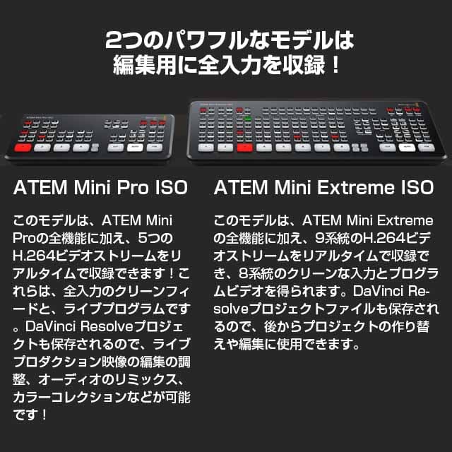 ATEM Mini Pro ISOは、フォーマット変換機能を搭載した4つのHDMI入力、USBウェブカム出力、EQとダイナミクスに対応したオーディオミキサー、2D DVE、トランジション、グリーンバッククロマキー、タイトル用の20個のスチルなどを搭載しています。