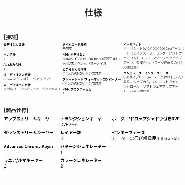 ・ビデオ収録/HDMI個別収録(ISO)入力×4。H.264の.mp4ファイル、ATEMビデオフォーマットで最大70Mb/s、AACオーディオ付き。