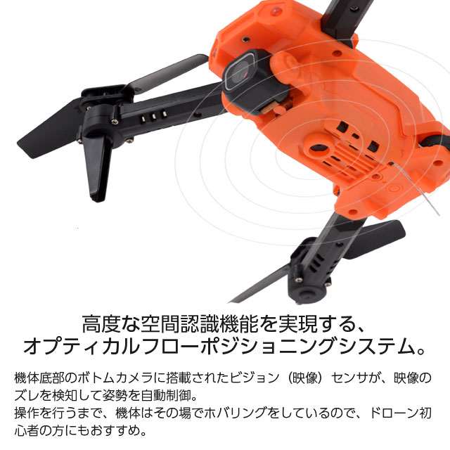 機体底部のボトムカメラに搭載されたビジョン(映像)センサが、映像のズレを検知して姿勢を自動制御。