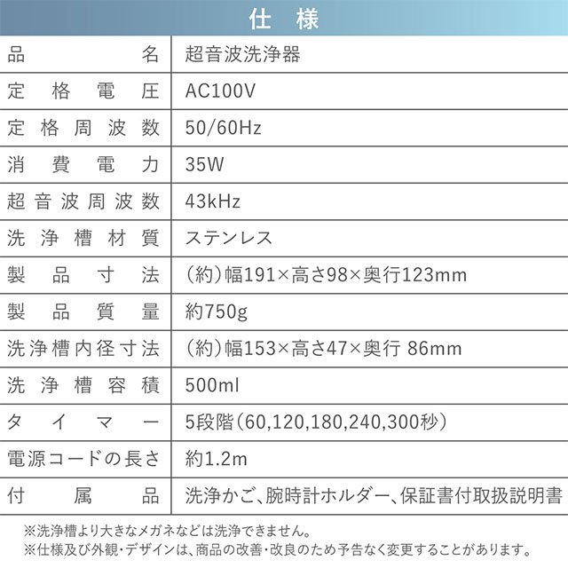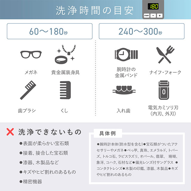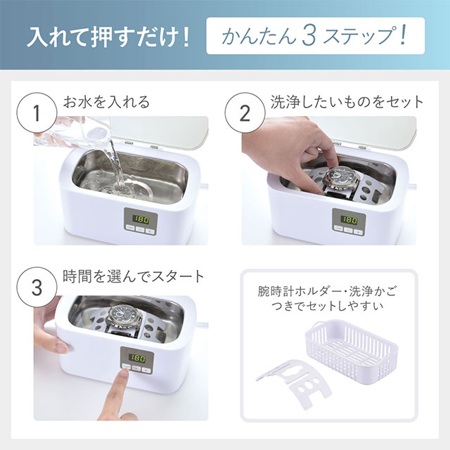 メガネや入れ歯、腕時計など毎日身につける物を、超音波の力で簡単に洗浄できます。