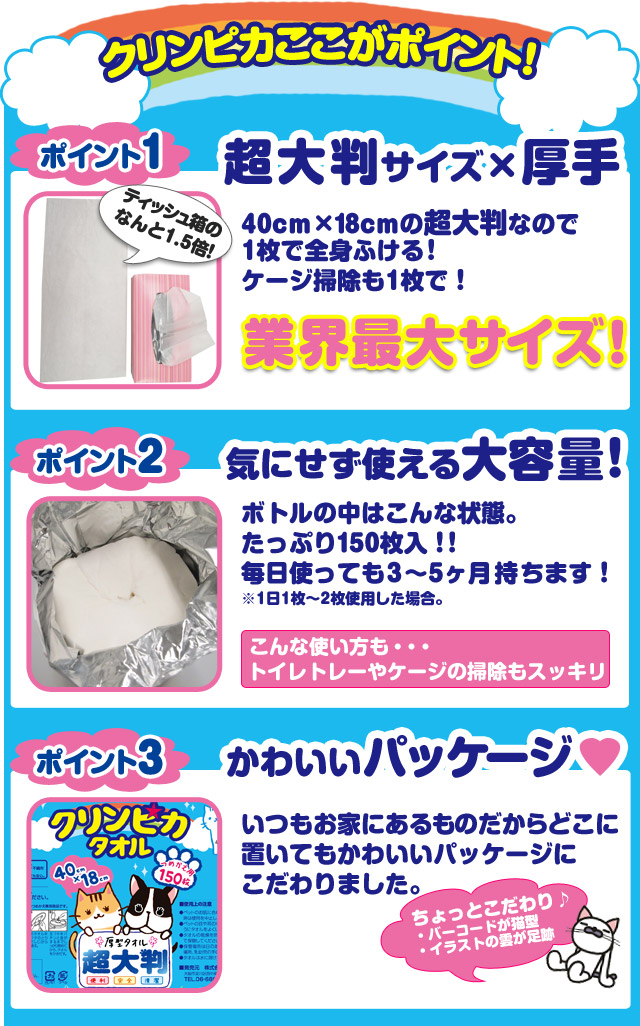 大きさは一般的なウェットティッシュの約1.5倍の厚さで破れにくく、通常のウェットティッシュじゃキレイキレイしにくいケージ周りやトイレのお掃除にも大活躍!