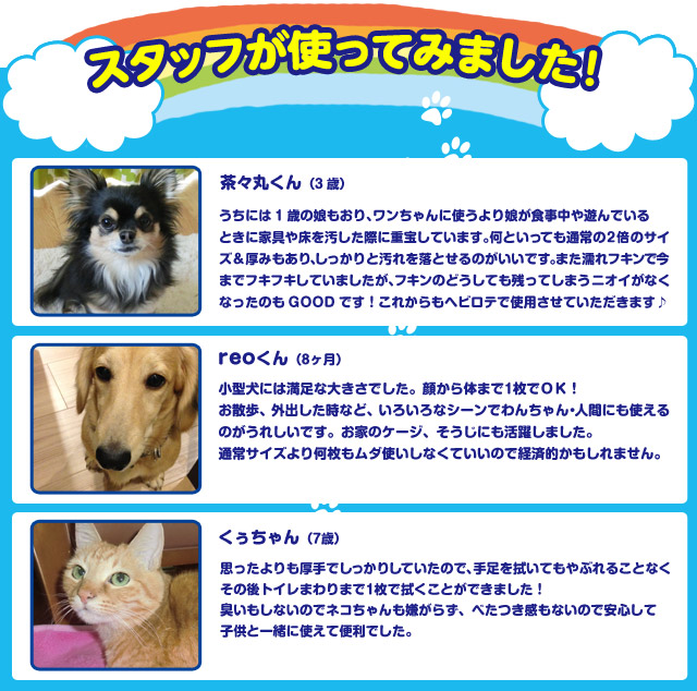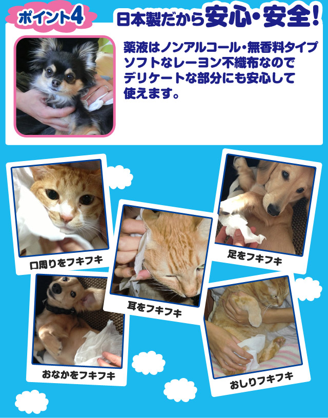 ワンちゃん・・・お散歩後の足拭き、お尻まわりのお手入れ、涙やけ・耳のお手入れ、シャンプーできない時の体拭き、ケージやトイレのお掃除。