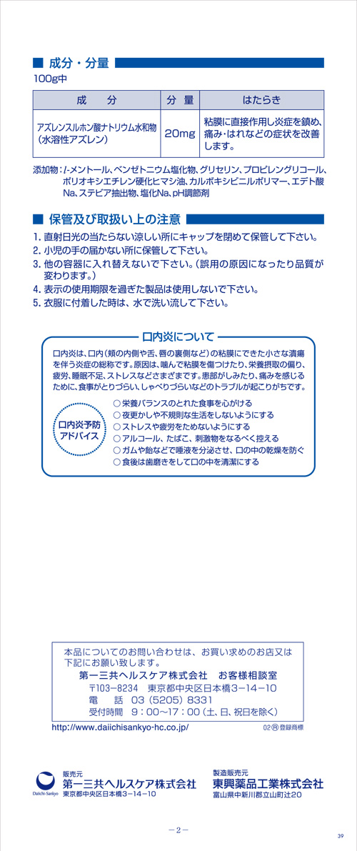 ・アズレンスルホン酸ナトリウム水和物・・・20mg(粘膜に直接作用し炎症を鎮め、痛み・はれなどの症状を改善します。