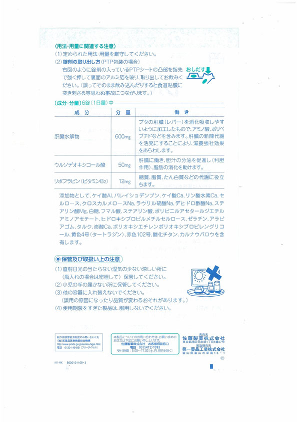 ●ブタの肝臓から得られた肝臓水解物に、ウルソデオキシコール酸、ビタミンB2を配合した糖衣錠です。
