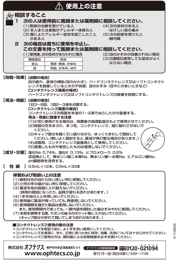 点眼の場合:目の疲れ、涙液の補助(目のかわき)、O2・ハードコンタクトレンズまたはソフトコンタクトレンズを装用している時の不快感、目のかすみ(目やにの多い時など)コンタクトレンズ装着の場合:O2・ハードコンタクトレンズまたはソフトコンタクトレンズの装着を容易にする