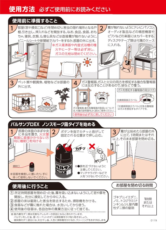 1.所定時間部屋を閉め切った後、霧を吸い込まないようにして窓や扉を開放し、充分に換気してから中に入る。