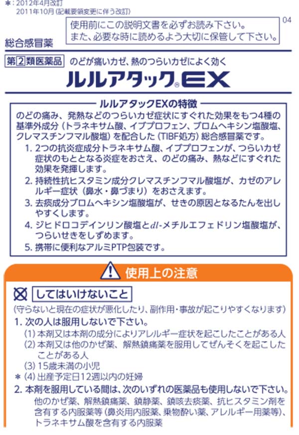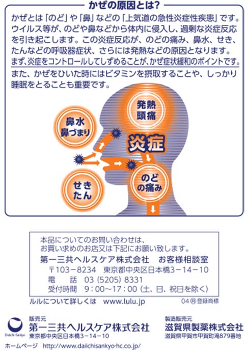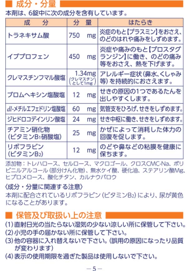 のどの痛み、発熱などのつらいカゼ症状にすぐれた効果をもつ4種の基準外成分(トラネキサム酸、イブプロフェン、ブロムヘキシン塩酸塩、クレマスチンフマル酸塩)を配合した(TIBF処方)総合感冒薬です。