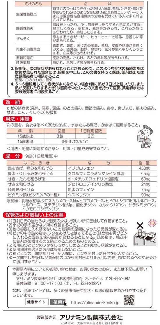 かぜの諸症状(発熱、悪寒、頭痛、のどの痛み、鼻水、鼻づまり、関節の痛み、筋肉の痛み、せき、たん、くしゃみ)の緩和