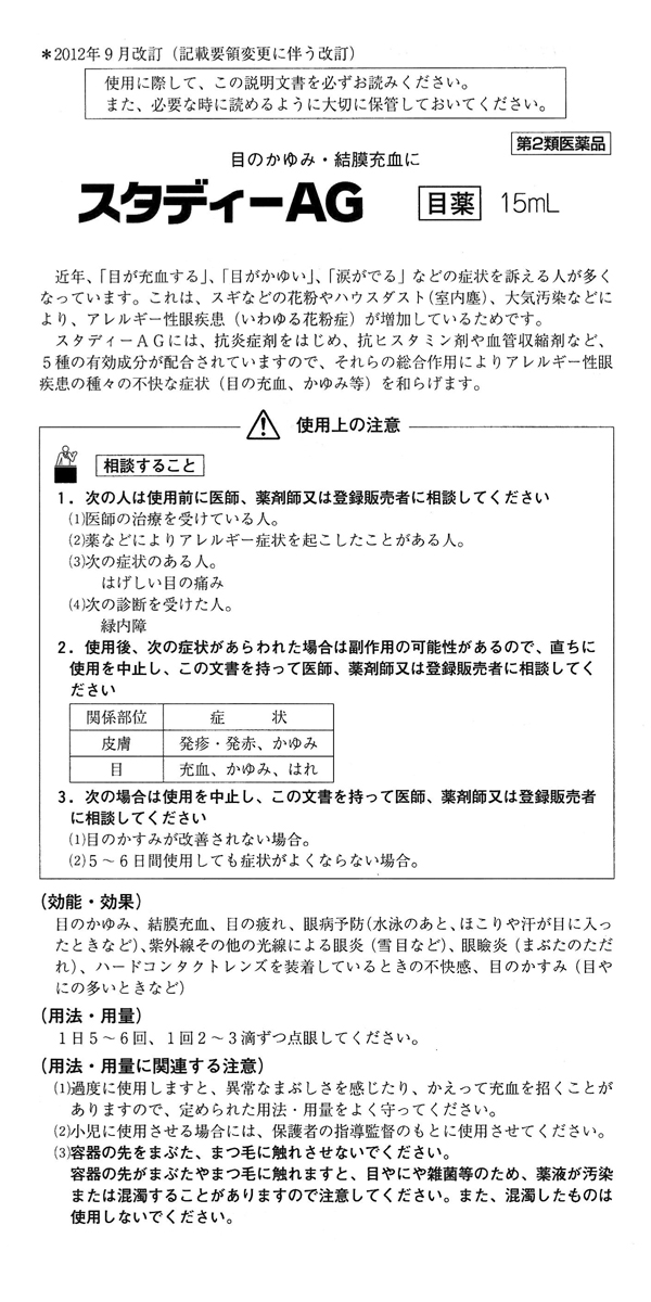 スタディーAGには、抗炎症剤をはじめ、抗ヒスタミン剤や血管収縮剤など、5種の有効成分が配合されていますので、それらの総合作用によりアレルギー性眼疾患の種々の不快な症状(目の充血、かゆみ等)を和らげます。