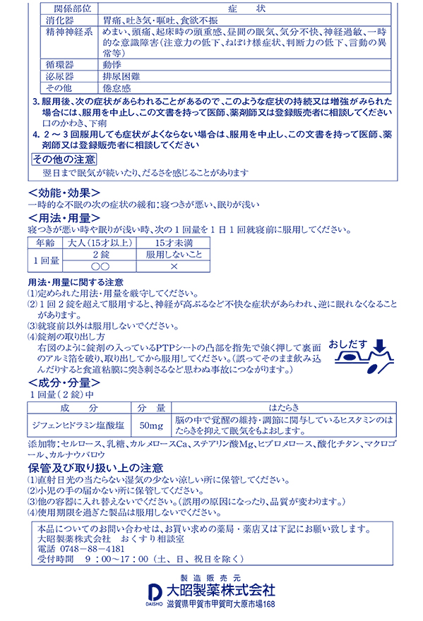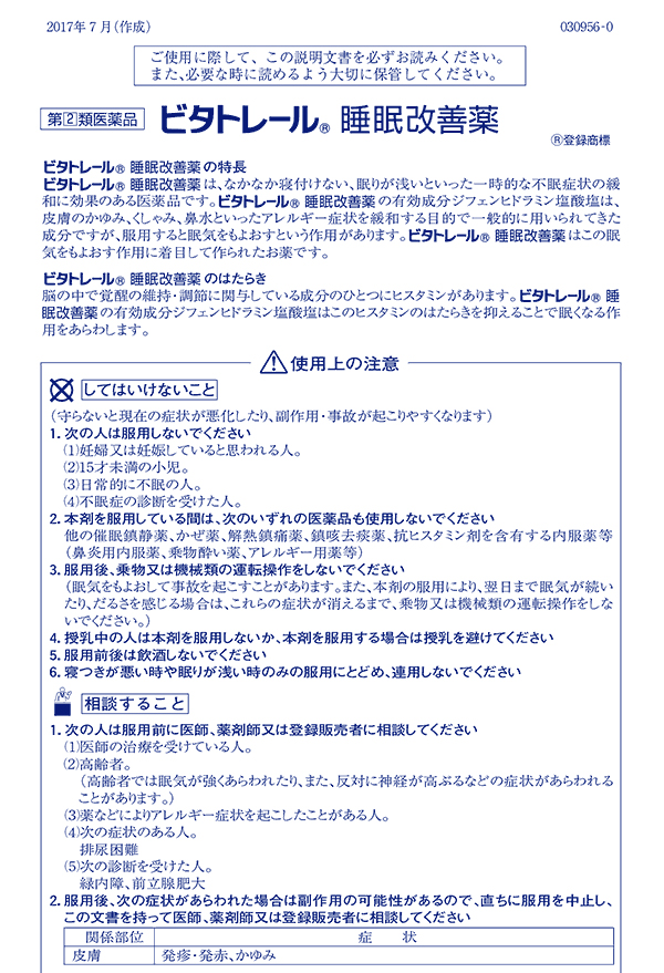 ビタトレール睡眠改善薬の有効成分ジフェンヒドラミン塩酸塩は、皮膚のかゆみ、くしゃみ、鼻水といったアレルギー症状を緩和する目的で一般的に用いられてきた成分ですが、服用すると眠気をもよおすという作用があります。