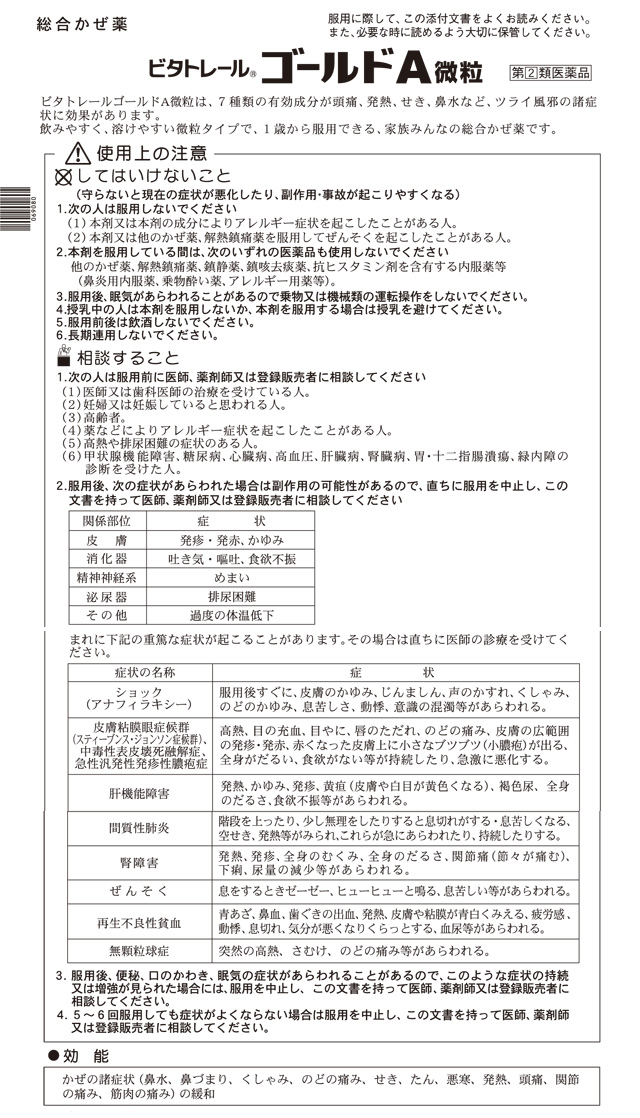 ビタトレール ゴールドA微粒は、7種類の有効成分が、頭痛、発熱、せき、鼻水など、ツライ風邪の諸症状に効果があります。