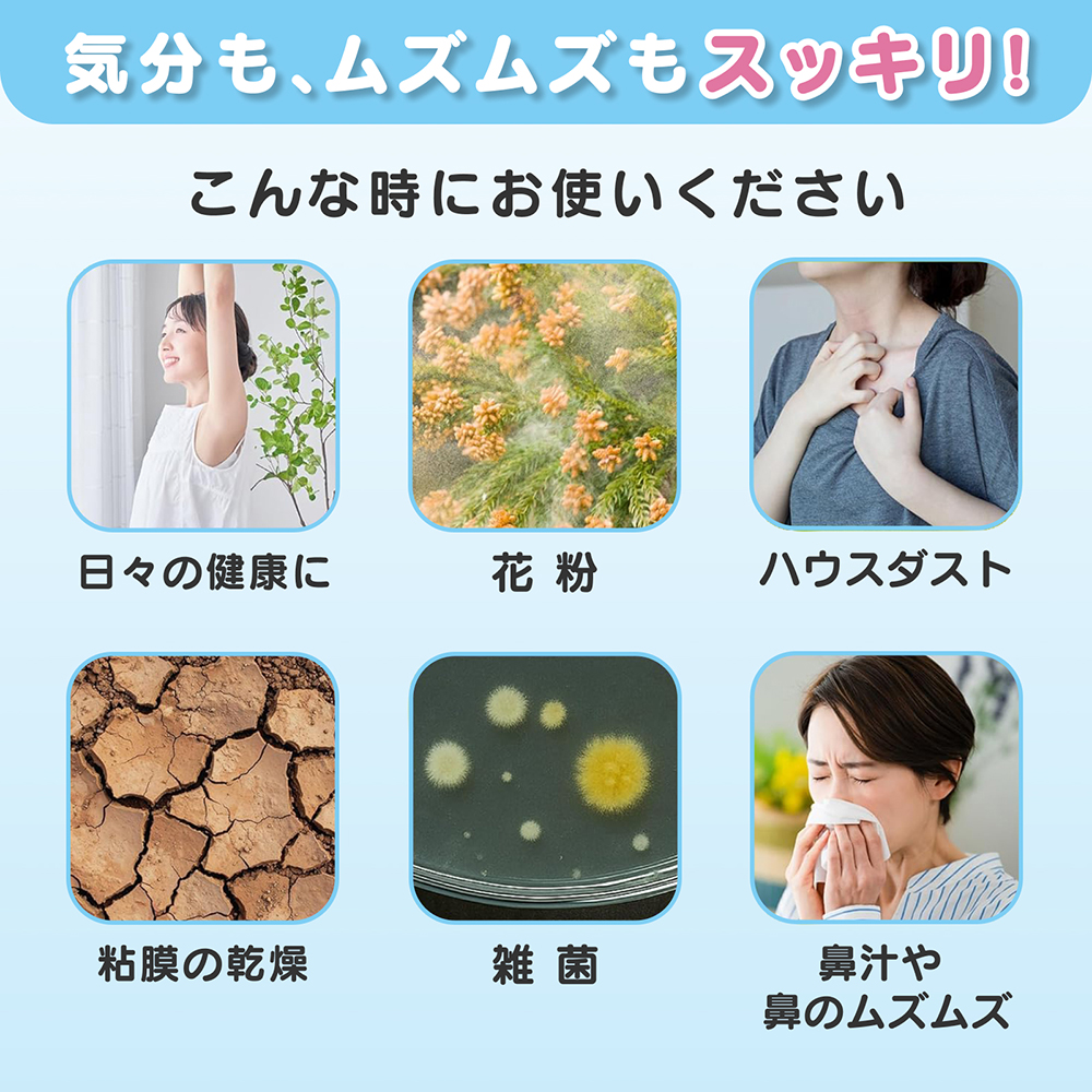 花粉、ハウスダスト、雑菌、鼻汁や鼻のムズムズ、粘膜の乾燥などに。
