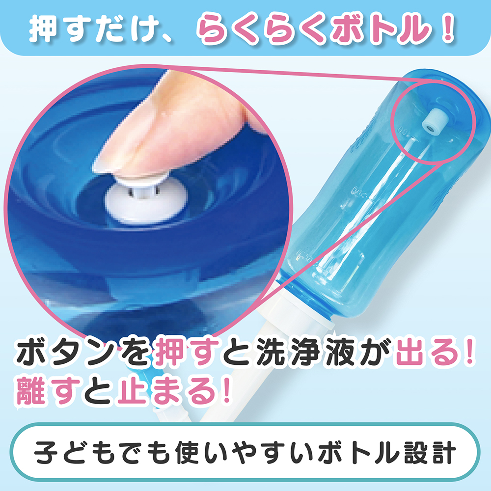 ボトルは、ボタンを押すと洗浄液が出て、離すと止まります。