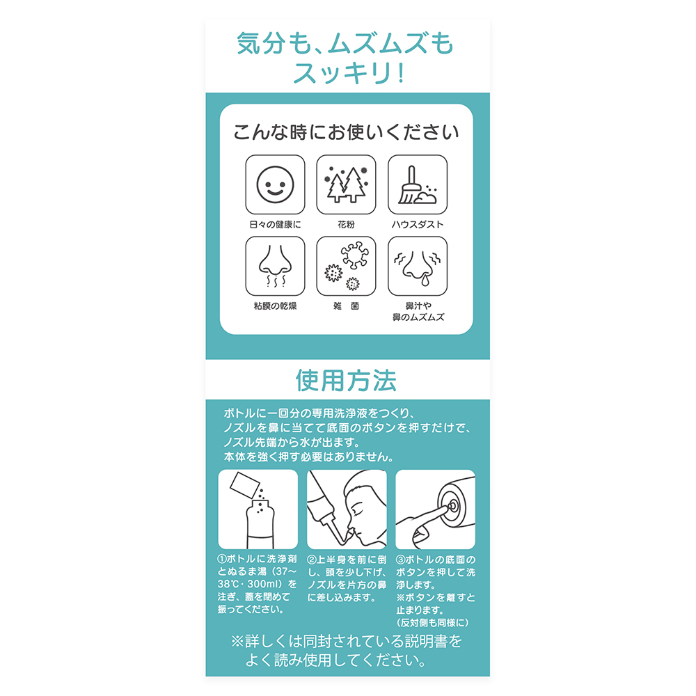最適な水圧で、どなたでも簡単に鼻洗浄ができます。