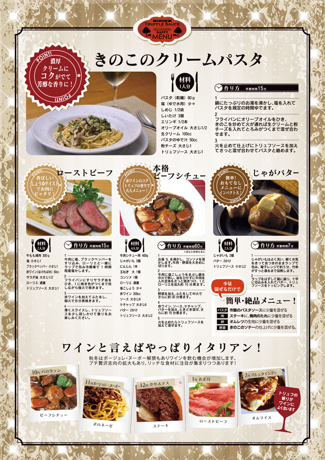 ヨーロッパ産の黒トリュフをぜいたくに使用した「トリュフソース」は、ご家庭のお料理をワンランクアップさせてくれます。