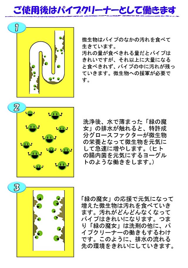 使用後、薄められた洗剤液の中の成分、グロースファクターは排水パイプの中に棲む汚れを食べる微生物に栄養を与え、その活動力=生分解力を高めます。このことにより、排水パイプの汚れは次第に分解されてきれいになり、また水まわりのいやな臭いも消え去ります。浄化槽も浄化力が高まります。
