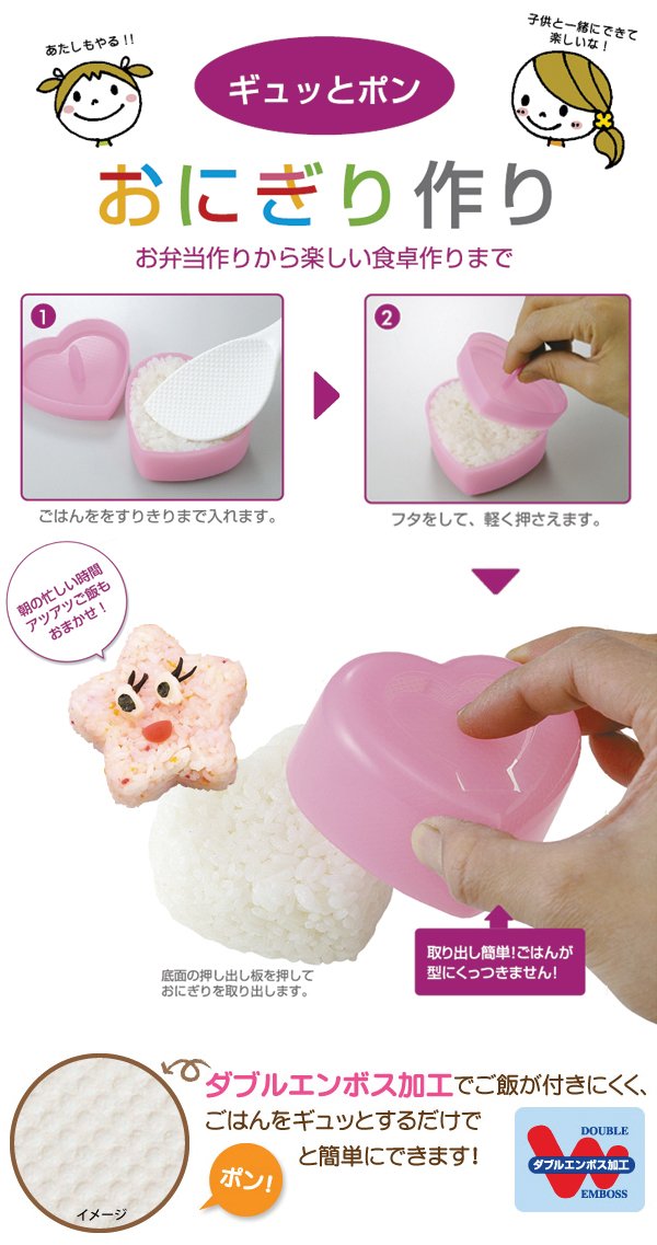「ギュッ」と詰めて「ポン!」ダブルエンボス加工でごはんがくっつかず、簡単にお星様型のおにぎりが作れます。