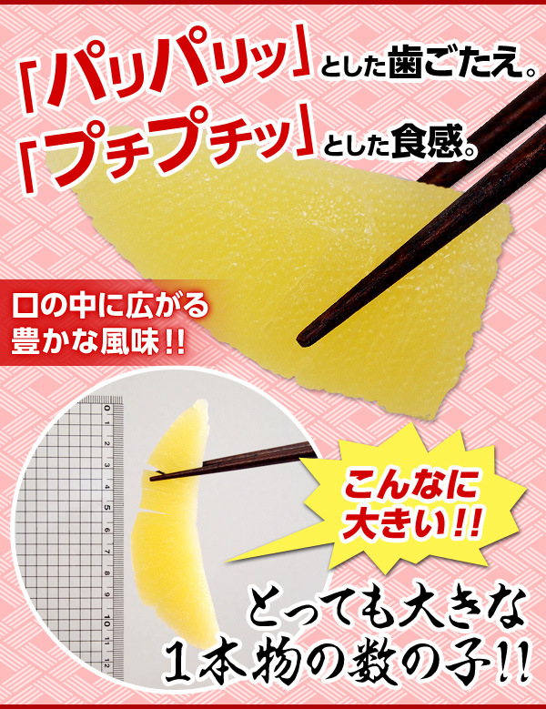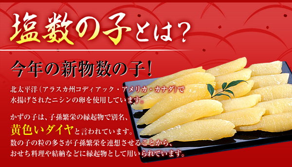 数の子の粒の多さが子孫繁栄を連想させることから、おせち料理や結納などに縁起物として用いられています。